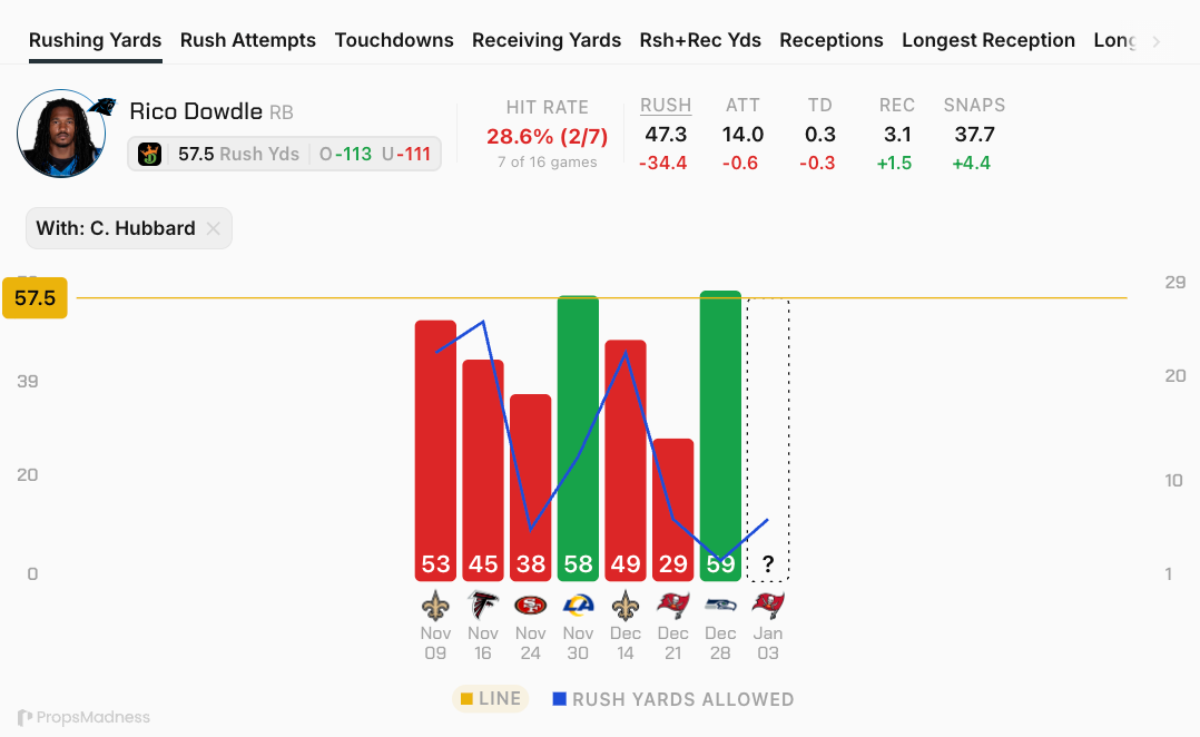 With Chuba Hubbard in the lineup, this is a line that Dowdle hasn’t consistently covered. Since his hot stretch, he’s gone under this line in 5 of his last 7, averaging 47.3 rushing yards.